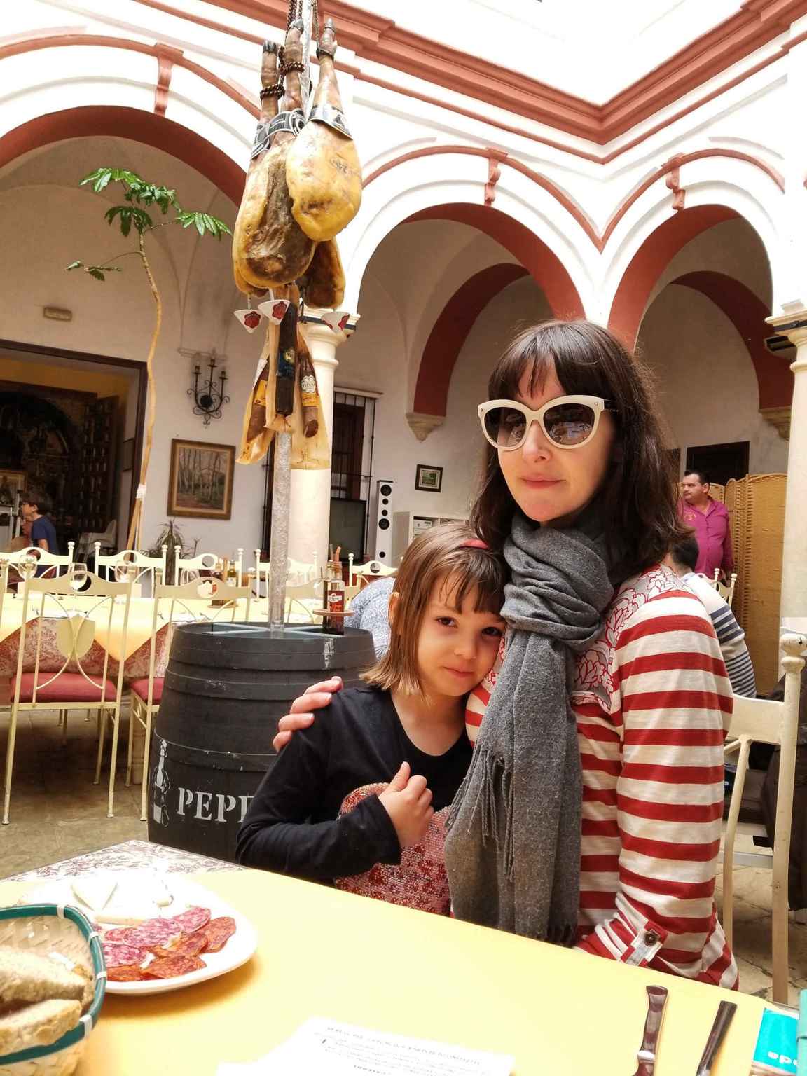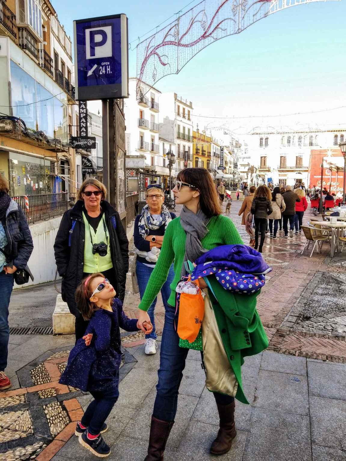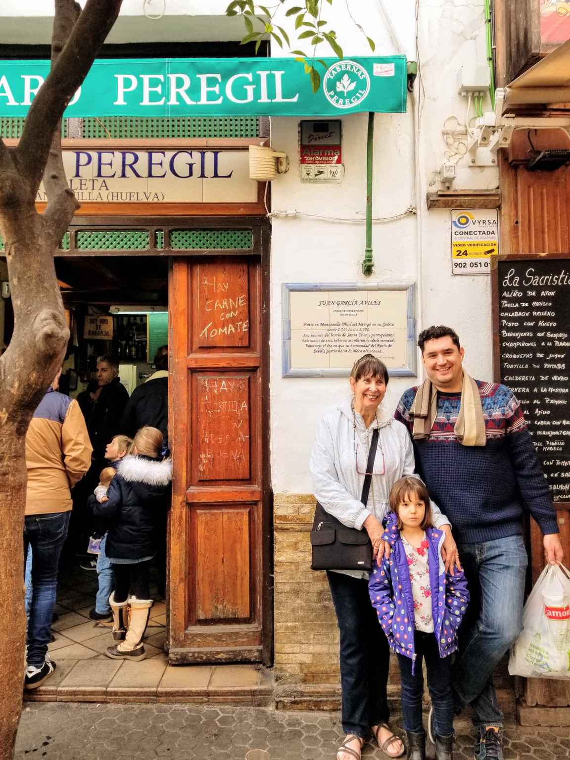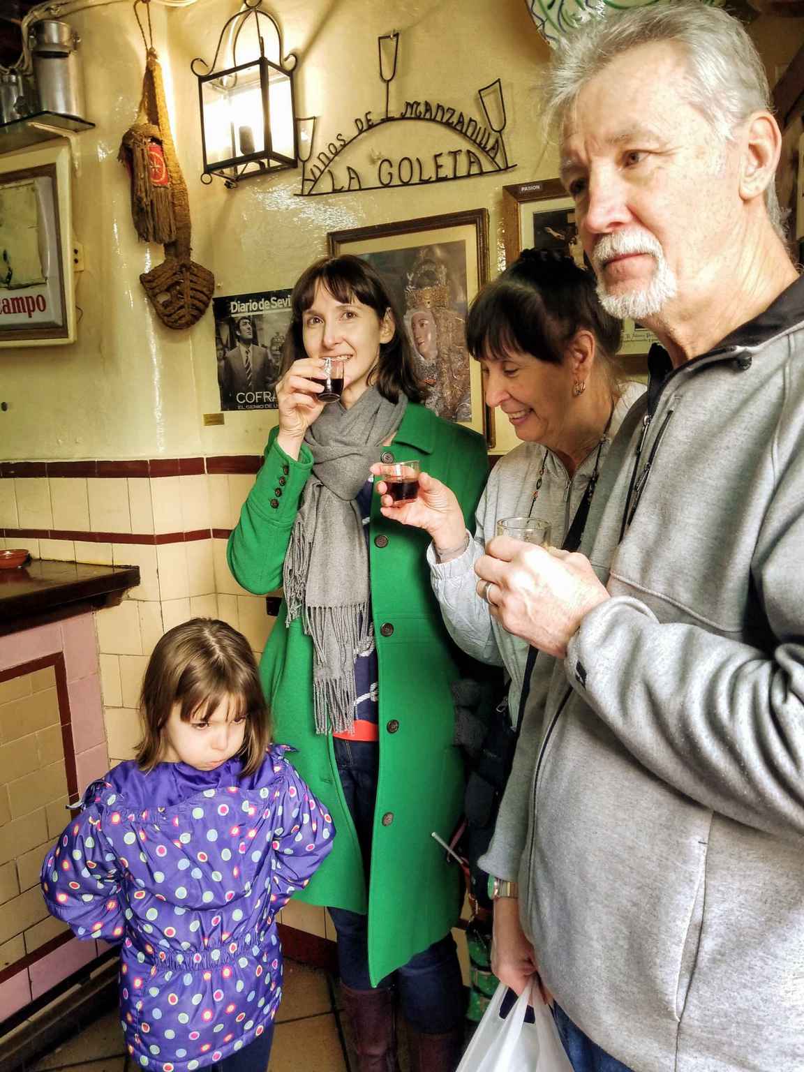 We started our trip with Christmas Eve in Seville. Jen booked us into a four-hour food tour for our first morning. Although everyone tried to be a good sport, there was some not so great food and a bit of boredom, especially for the kiddo … and Grandpa. Our tour included a stop at La Fresquita a “Semana Santa” bar full of religious iconography celebrating Holy Week. The kid didn’t understand why we were surrounded by paintings of people wearing crowns of thorns and crying blood. Grandma’s explanations didn’t seem to resolve her questions. Apparently her “world views” religion class at JFKS is not preparing her for this stuff.